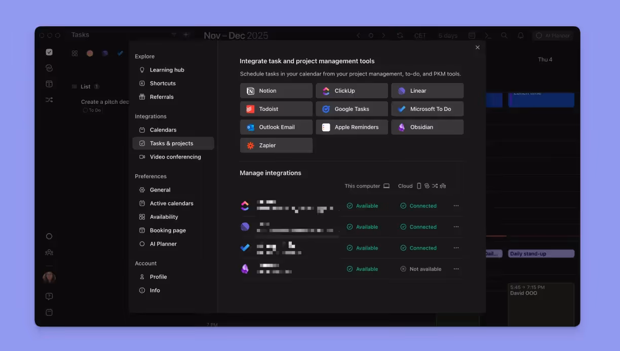 Morgen pulls tasks from Notion, Linear, ClickUp, Obsidian, Todoist, Google Tasks, and Microsoft To Do directly into your calendar sidebar with native properties to reduce context-switching.