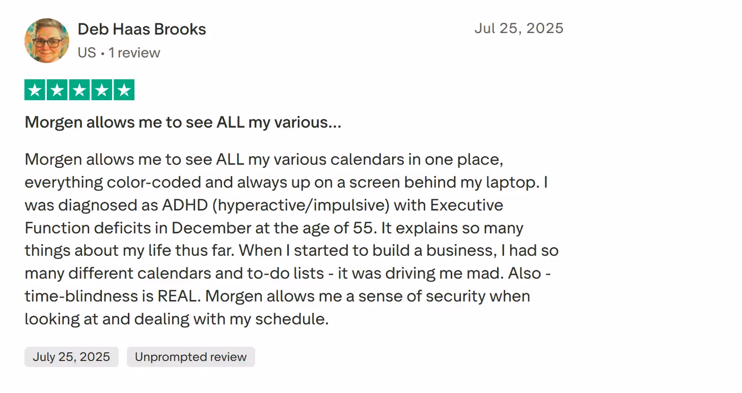 "Morgen allows me to see ALL my various calendars in one place, everything color-coded and always up on a screen behind my laptop," shares Deb Haas Brooks.