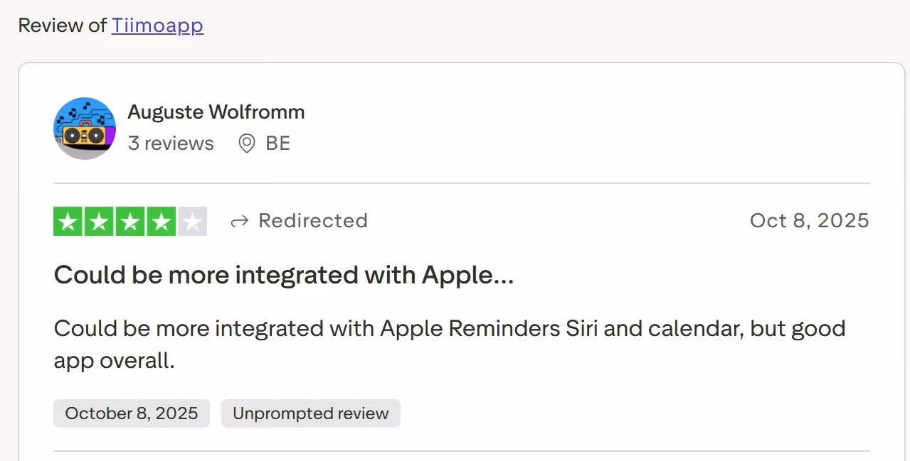 "Could be more integrated with Apple Reminders, Siri, and calendar, but good app overall," says Auguste Wolfromm.