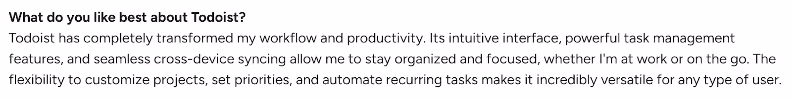 "Todoist has completely transformed my workflow and productivity," shares Rami A.