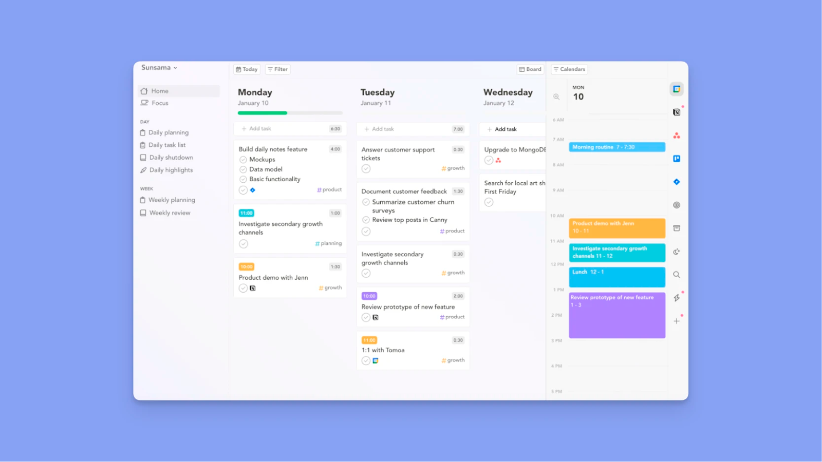 Sunsama is a daily planning and productivity tool built around a guided ritual-based workflow that helps you plan, focus, and reflect on your work each day.