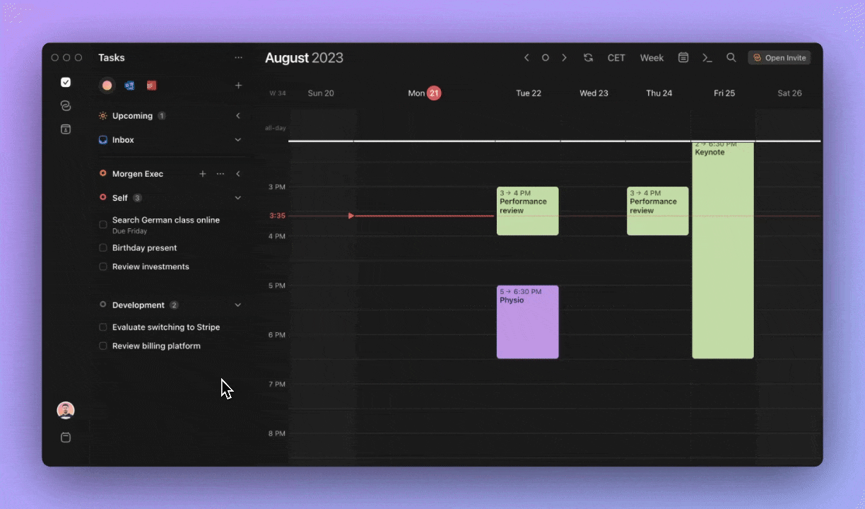 Morgen integrates with Google Calendar, FastMail, and iCloud, and lets you pull tasks from Notion, Linear, ClickUp, Obsidian, and Todoist. With these integrations, you capture events and tasks and time-block them into your calendar view with simple drag-and-drop.