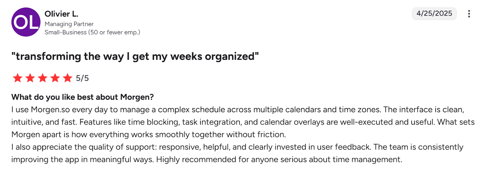 "I use Morgen.so every day to manage a complex schedule across multiple calendars and time zones," says Olivier L: