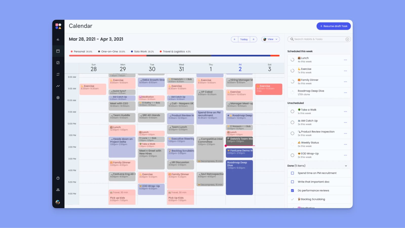 → Flexible habit scheduling: Protects time for recurring habits like meals and exercise by automatically finding new slots when urgent meetings pop up