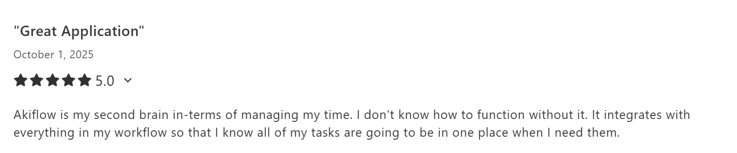 "Akiflow is my second brain in terms of managing my time. I don't know how to function without it," says Austin M.