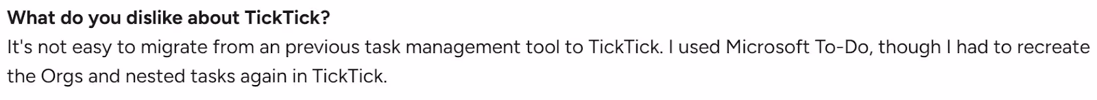 "It's not easy to migrate from a previous task management tool to TickTick," shares Sunil K.