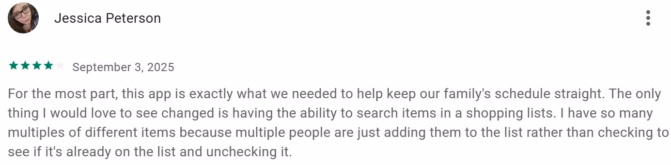 Jessica Peterson says Cozi keeps the family schedule organized, but the lack of search in shopping lists leads to duplicate items when multiple people add things.