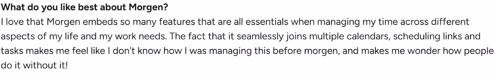 "I love that Morgen embeds so many features that are all essentials when managing my time across different aspects of my life and my work needs," says Enea C.