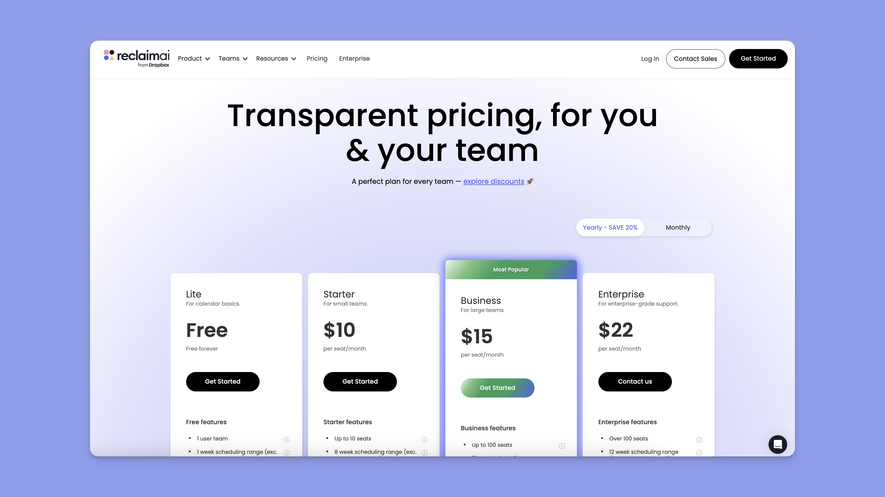 Pricing is often the deciding factor between Motion vs Reclaim. Motion’s pricing reflects its heavy automation and enterprise capabilities, while Reclaim remains accessible and budget-friendly for individuals. Here’s how they compare.