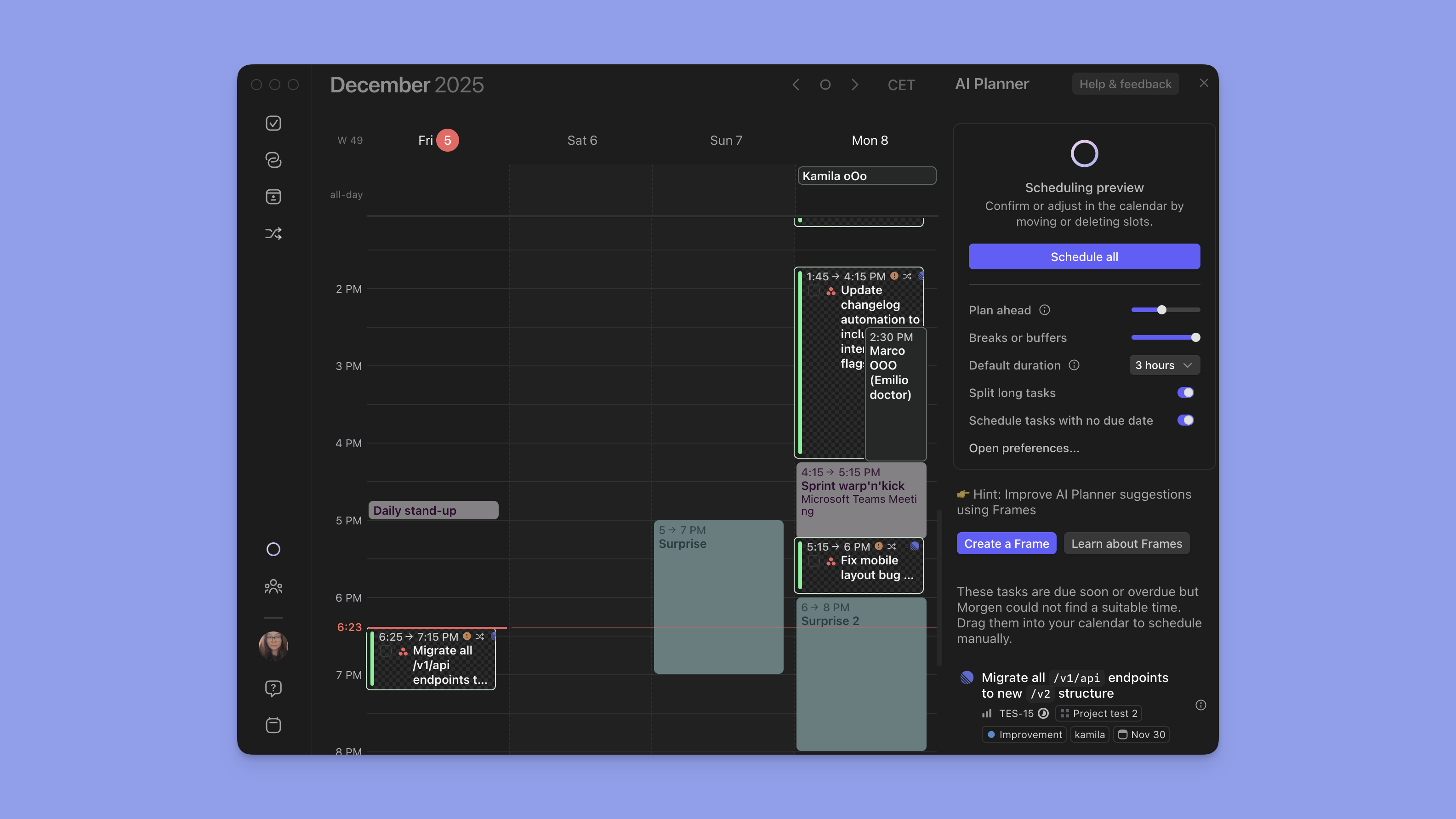 Morgen boosts flexibility with buffer time management, travel-time scheduling, multi-calendar conflict detection, and optional deep-work “Frames.” It’s ideal if your schedule includes commuting, personal errands, and shifting tasks.