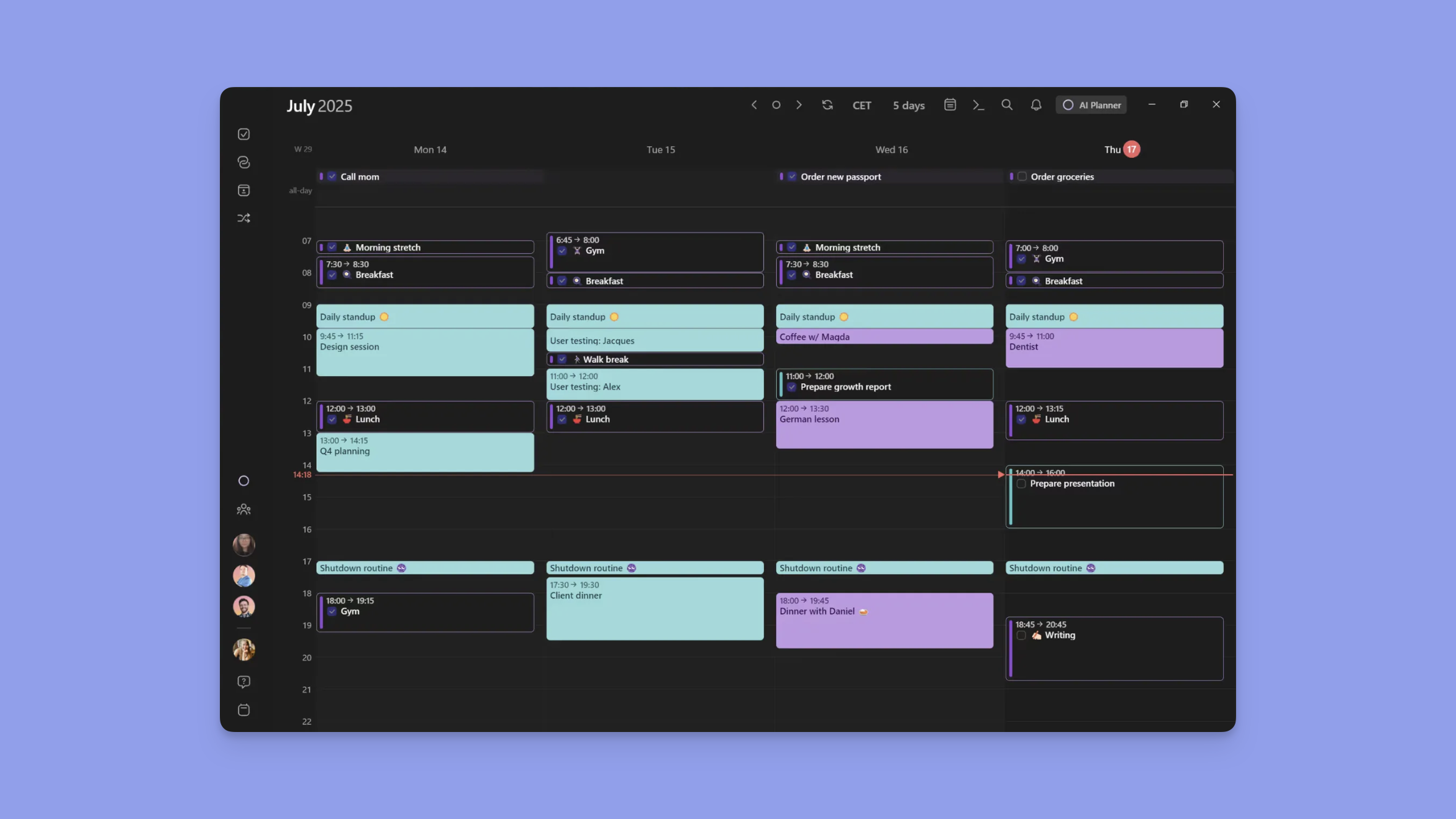 - Smart time blocking across Meetings, Focus Time, Tasks, and Habits