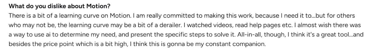 "There is a bit of a learning curve on Motion. I am really committed to making this work, because I need it to," shares a verified user on G2: