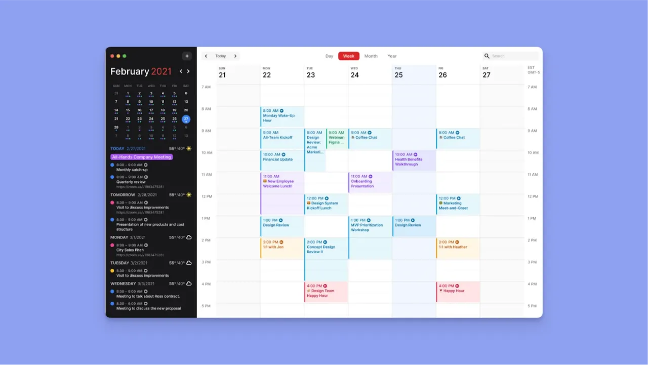 - Planning context built in: Weather forecasts appear alongside your schedule, helping you plan travel, meetings, and outdoor commitments realistically