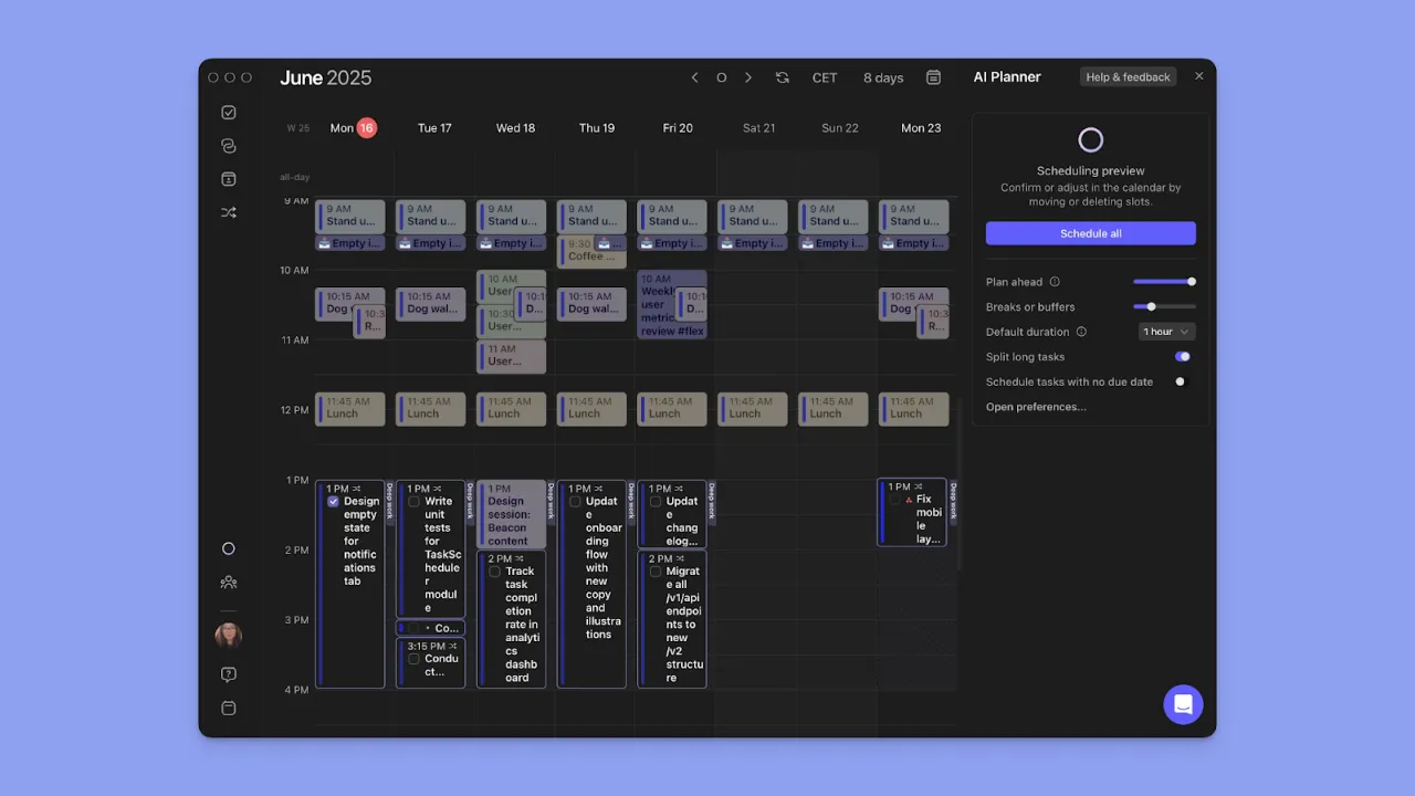 - Planning with clarity: You commit only to tasks you can realistically handle, then block time directly on your calendar with true two-way syncing to stay focused