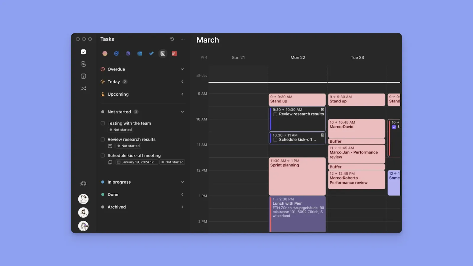 Morgen integrates calendars, task managers, and video conferencing tools into a single planning surface, so you schedule tasks and meetings without leaving the app and sync every change to the source tools.