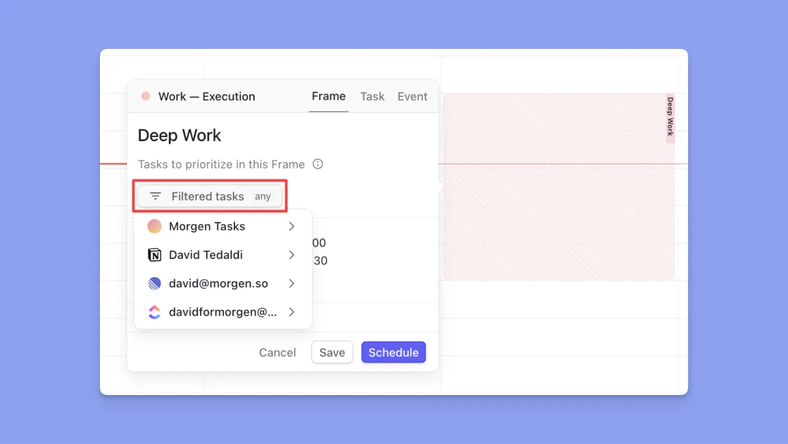Moregn Frames are recurring or one-off time blocks that define when you focus on specific types of work, such as deep work, meetings, or personal tasks. You can schedule tasks directly into Frames by dragging them in or letting the AI recommend tasks that match the Frame’s purpose, priority, and availability rules.