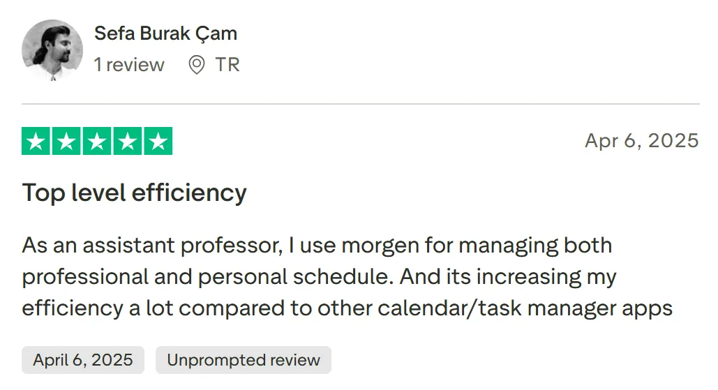 On TrustPilot, Sefa Burak Çam says Morgen has increased his efficiency a lot: