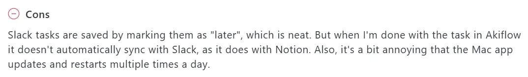 "Slack tasks are saved by marking them as 'later', which is neat. But when I'm done with the task in Akiflow, it doesn't automatically sync with Slack," says a user on Capterra.