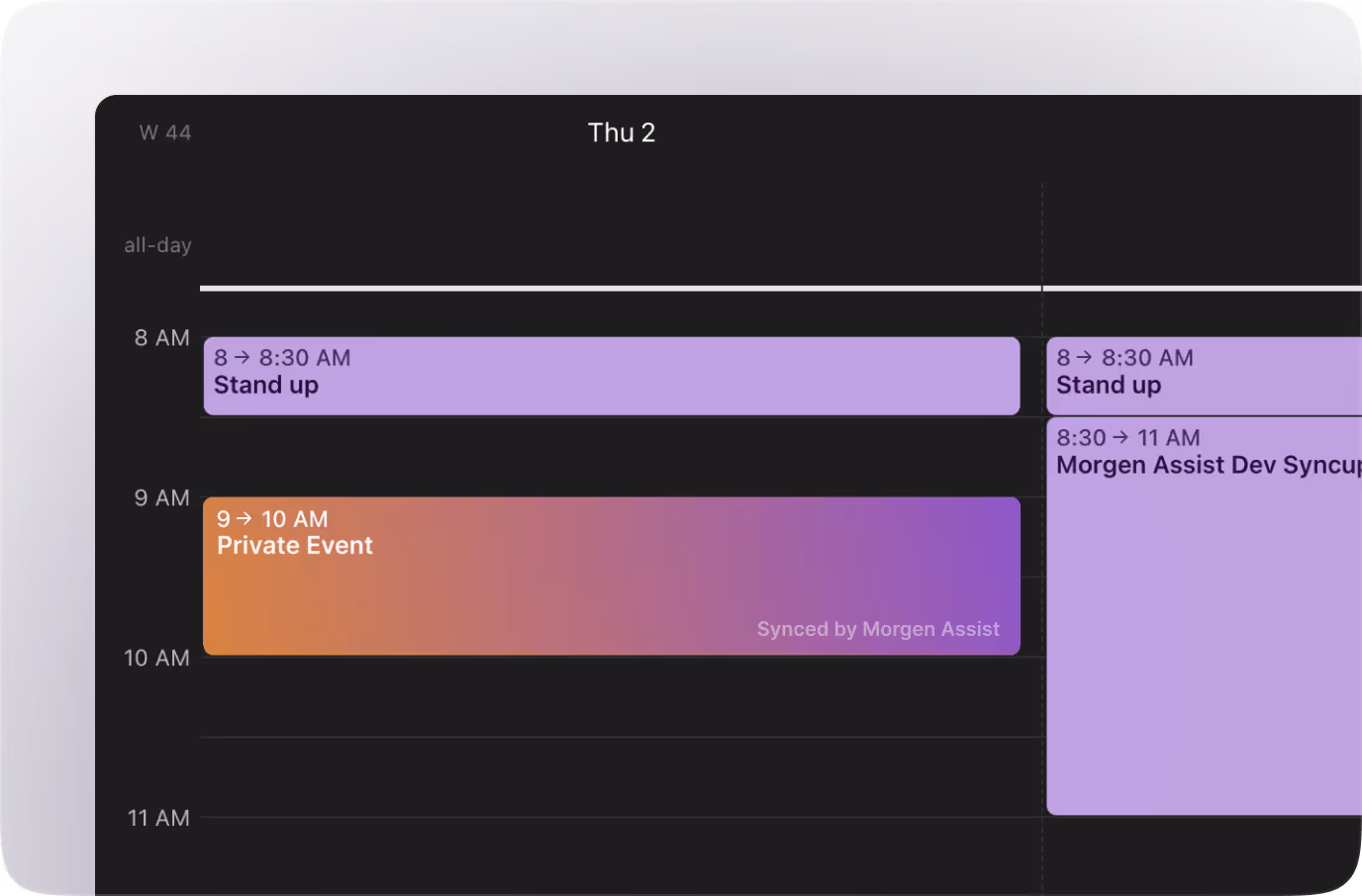 Si te encuentras saltando entre calendarios para gestionar tu tiempo, cancelando o reprogramando reuniones frecuentemente porque tienes doble reserva, o añadiendo manualmente bloqueadores de tiempo personal a tu calendario de trabajo, la propagación de calendario de Morgen es una solución rápida para mantener tus calendarios sincronizados. Lo mejor de todo es que si activas el Modo Nerd, incluso puedes personalizar qué eventos se sincronizan entre calendarios.
