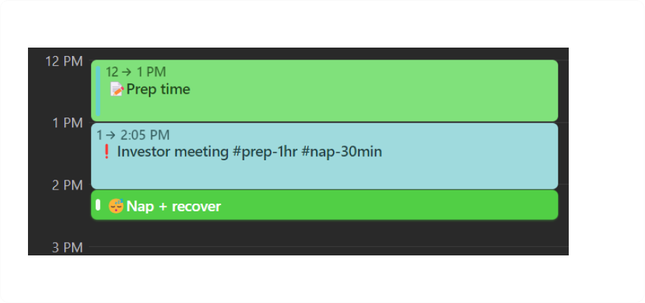 - Regola la quantità di tempo di preparazione in base all'hashtag, "-1h" per quella chiamata importante con un potenziale nuovo investitore, e magari "-10m" per lo standup mattutino mentre ci sei.